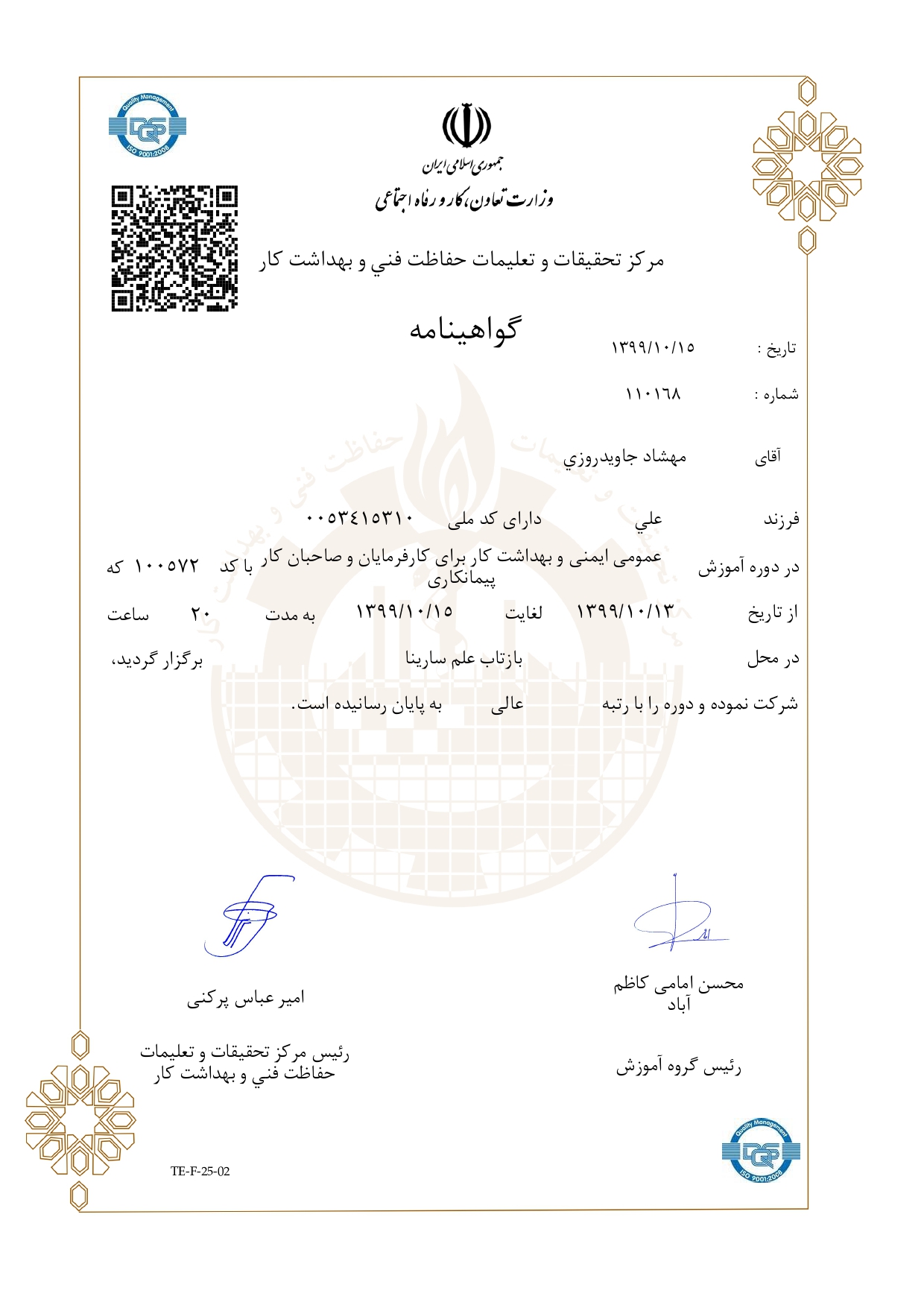 گواهی صلاحیت ایمنی رمضانی